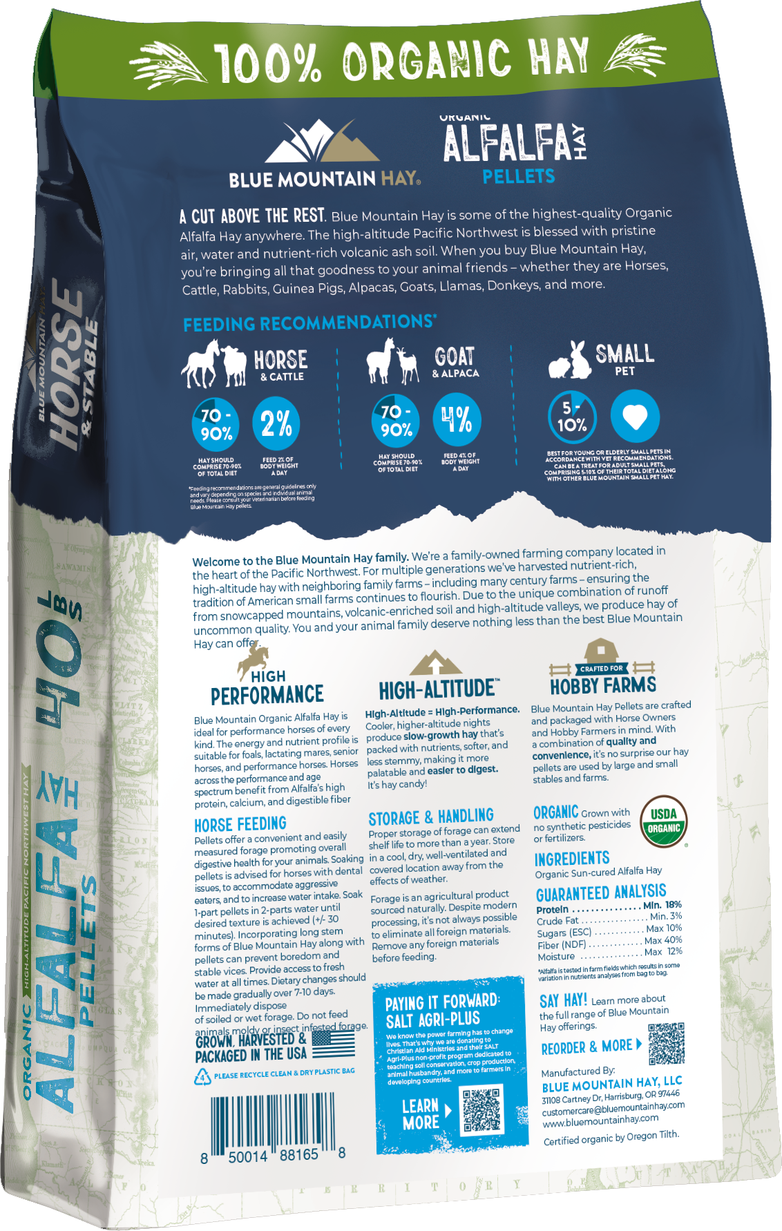 USDA Certified organic and grown in the Pacific Northwest, these pellets are packed with protein, fiber, and minerals to support growth and overall health. Their soft, nutrient-dense profile makes them highly palatable for horses, rabbits, guinea pigs, and sheep. Dust-free and easy to feed, they offer clean, convenient nutrition in every serving.