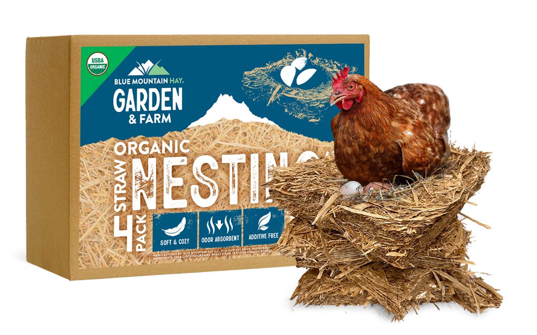 The perfect organic bedding straw and nesting pads for your flock. Our 100% USDA Organic straw provides a cozy, natural space for hens to lay their eggs and rest comfortably. Soft, absorbent, and dust-free, it helps protect eggs, keeps nests fresh, and creates a clean, healthy coop environment. Grown in the pristine Pacific Northwest, our straw is completely free from chemicals, colorings, and additives — a little piece of natural comfort for every feathered friend.